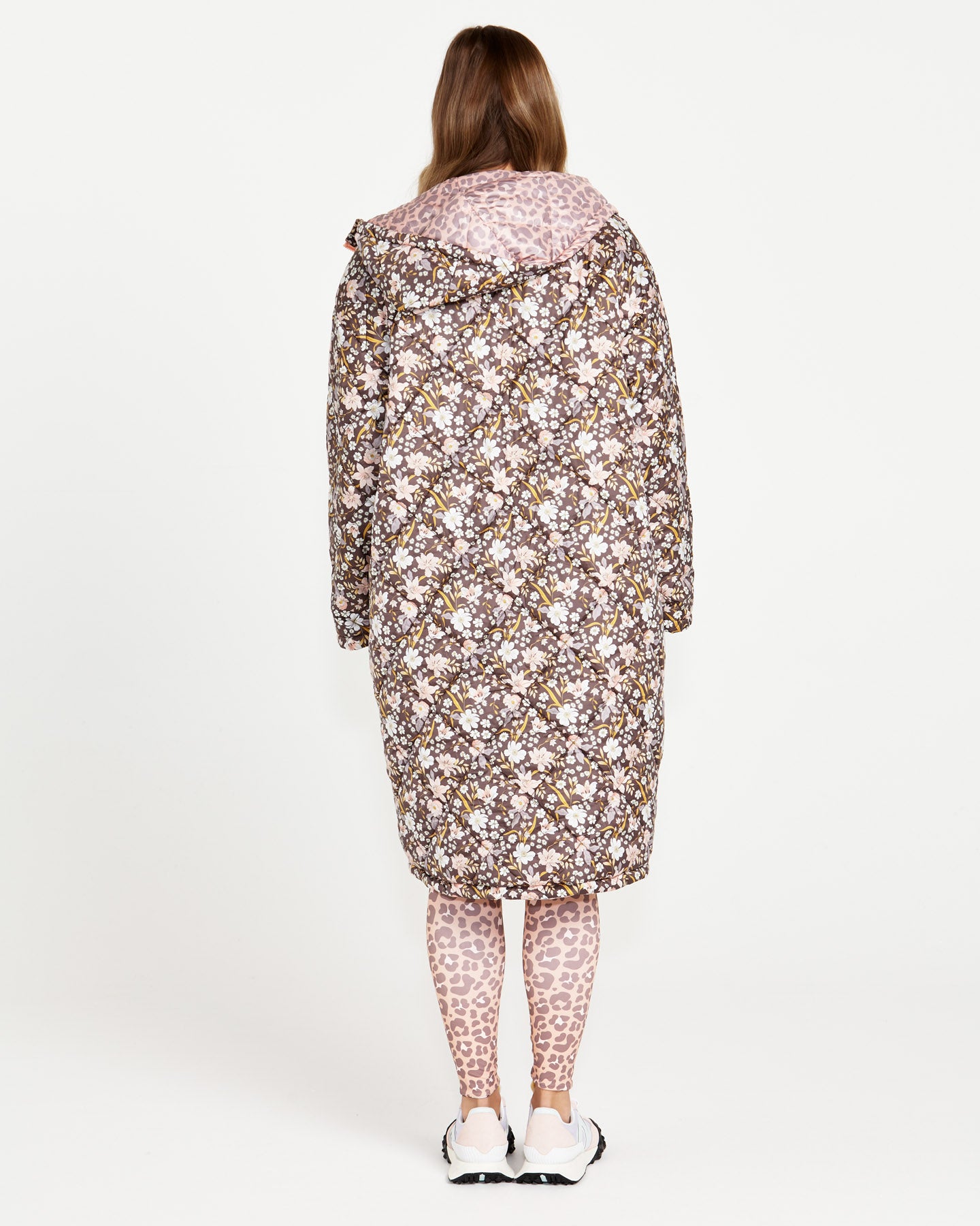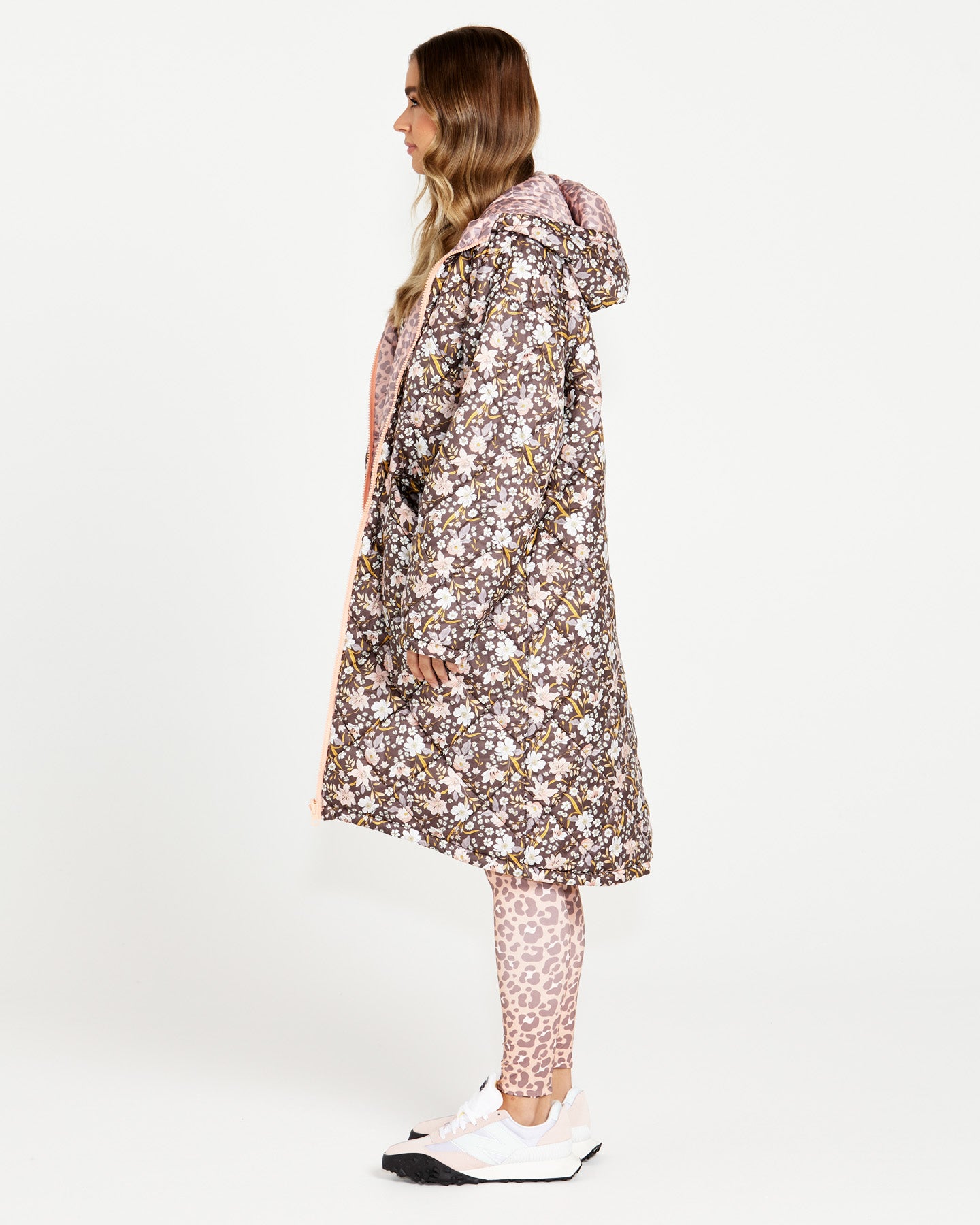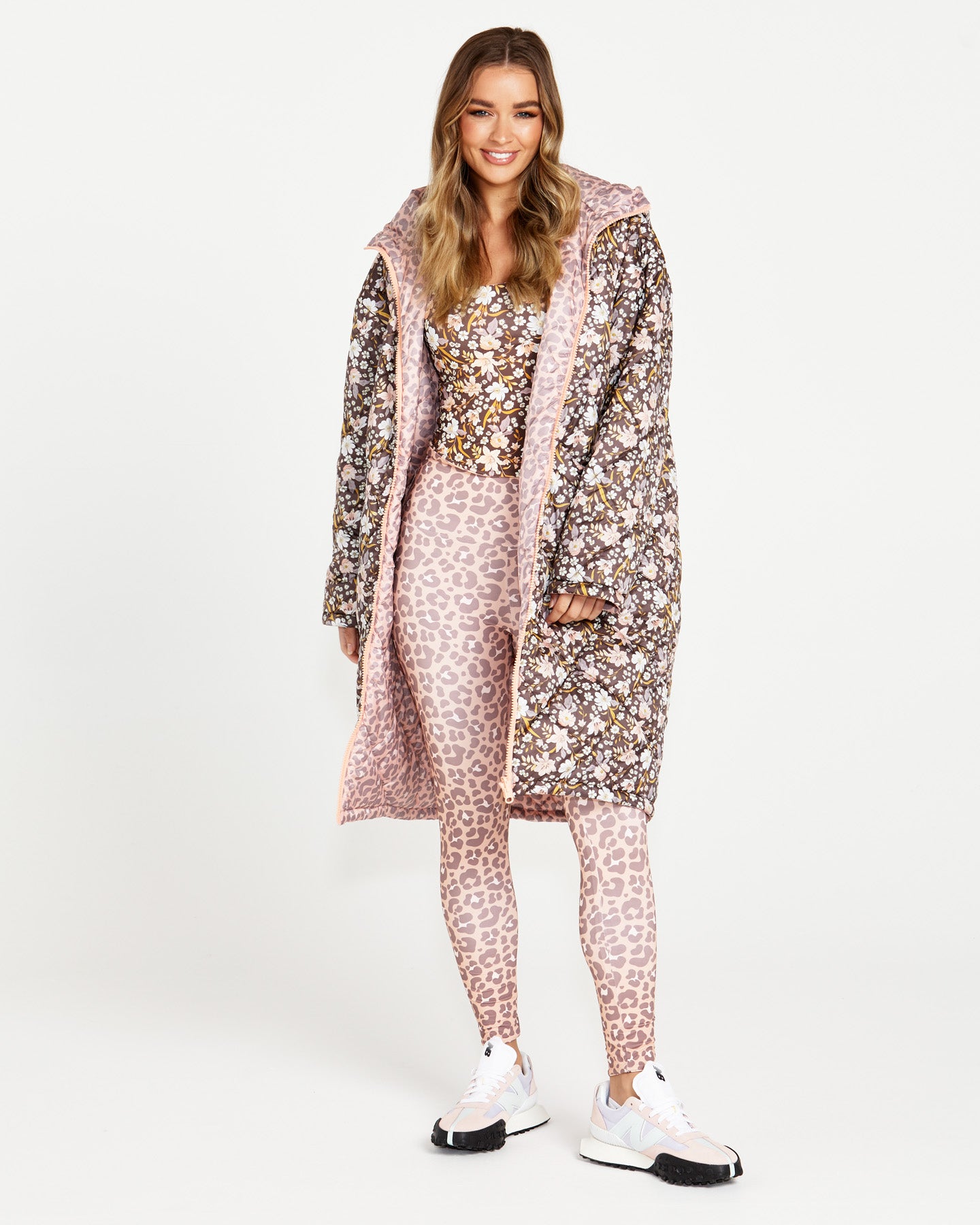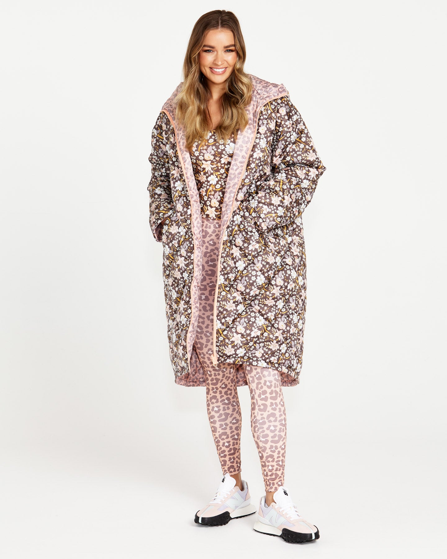 Alessia Reversible Long Puffer Jacket - Chocolate Floral/Pink Cheetah
