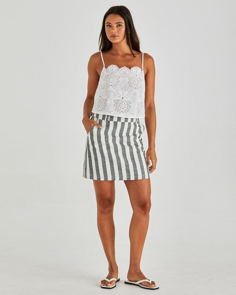 A warm-weather essential, the Ani Cami features a scalloped neckline and thin adjustable straps for a perfect fit. Unlined and easy to wear, it’s made for layering or standing out on its own. Light, breezy, and effortlessly on-trend.