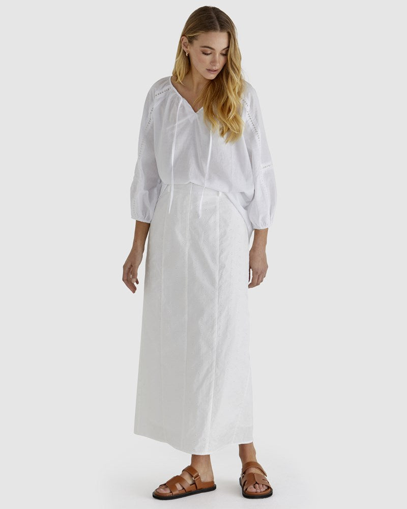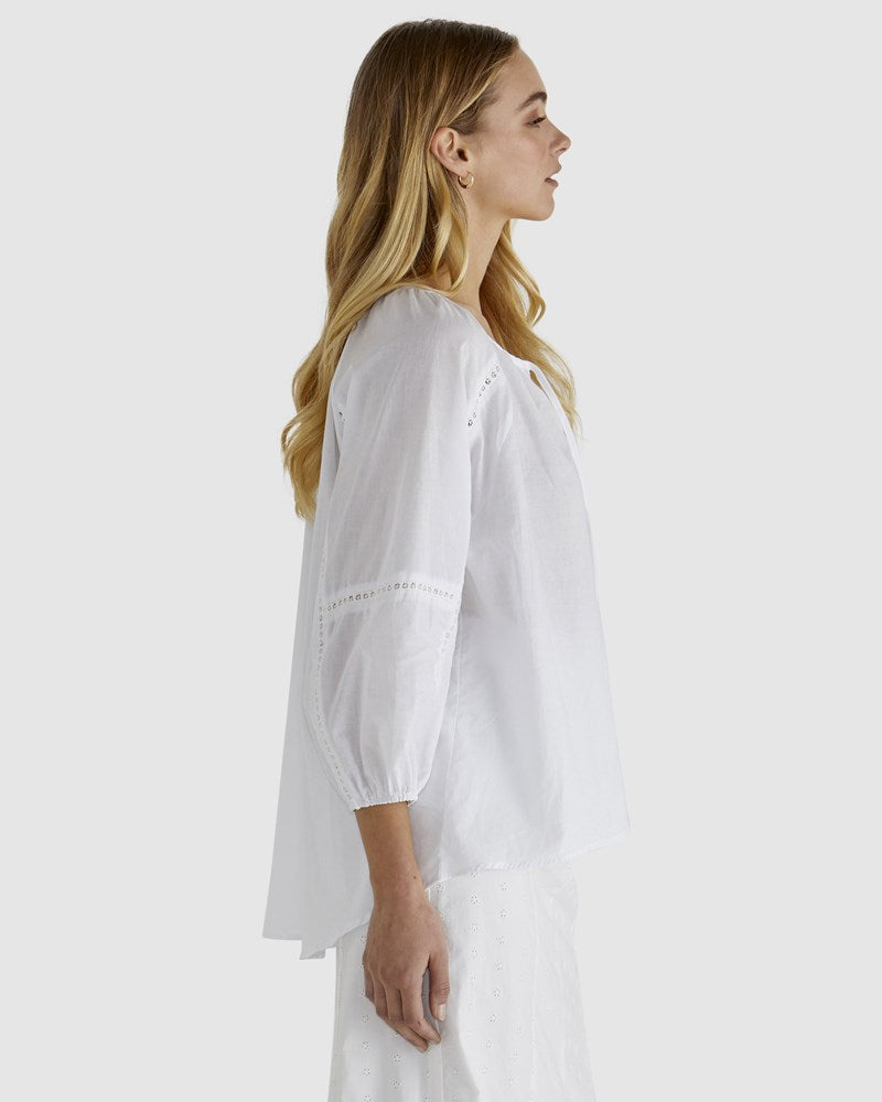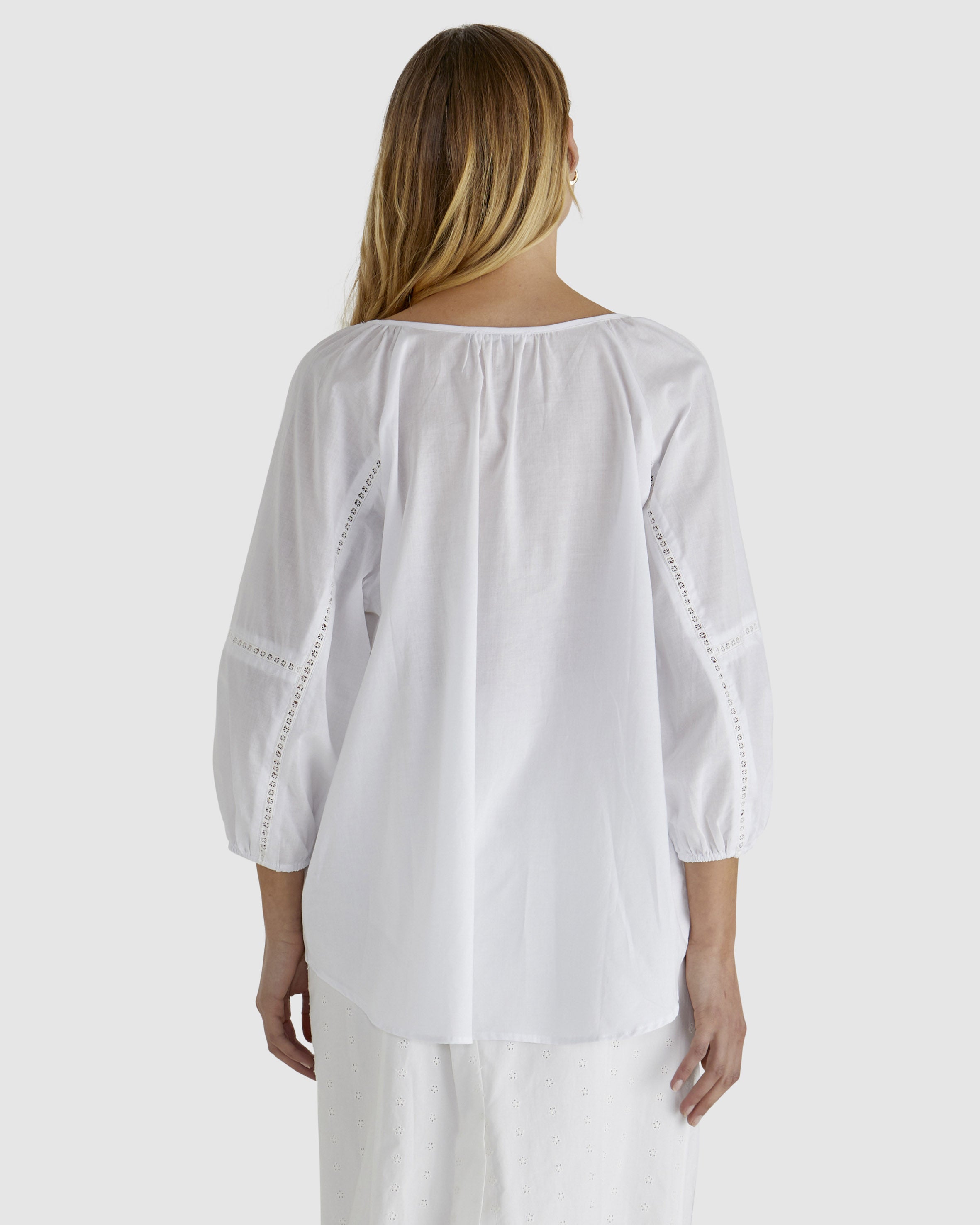 The Chantel Top is a beautiful blend of feminine details and relaxed comfort. Featuring a 3/4 sleeve with an elasticated hem, keyhole neckline, and lace details, this top is effortlessly chic and ideal for adding a soft, elegant touch to any outfit.