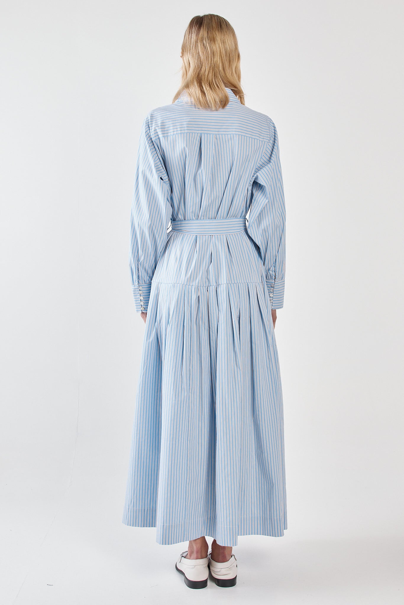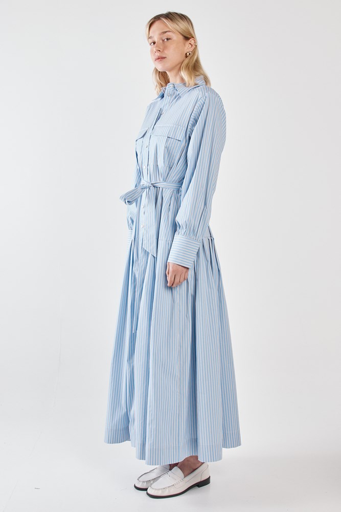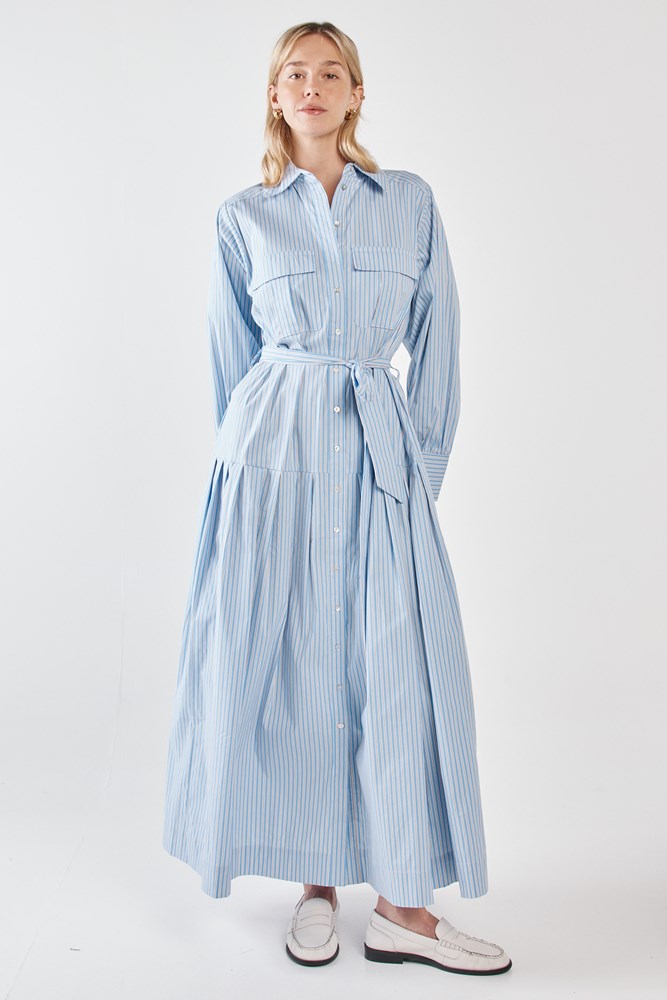 The Christa Stripe Shirt Dress is polished tailoring with an effortless twist. Featuring chest pockets and a dropped waist pleat, it feels modern and on-trend while remaining wearable. The self-fabric tie allows for subtle shaping or relaxed styling. A trans-seasonal piece designed for elevated everyday dressing.