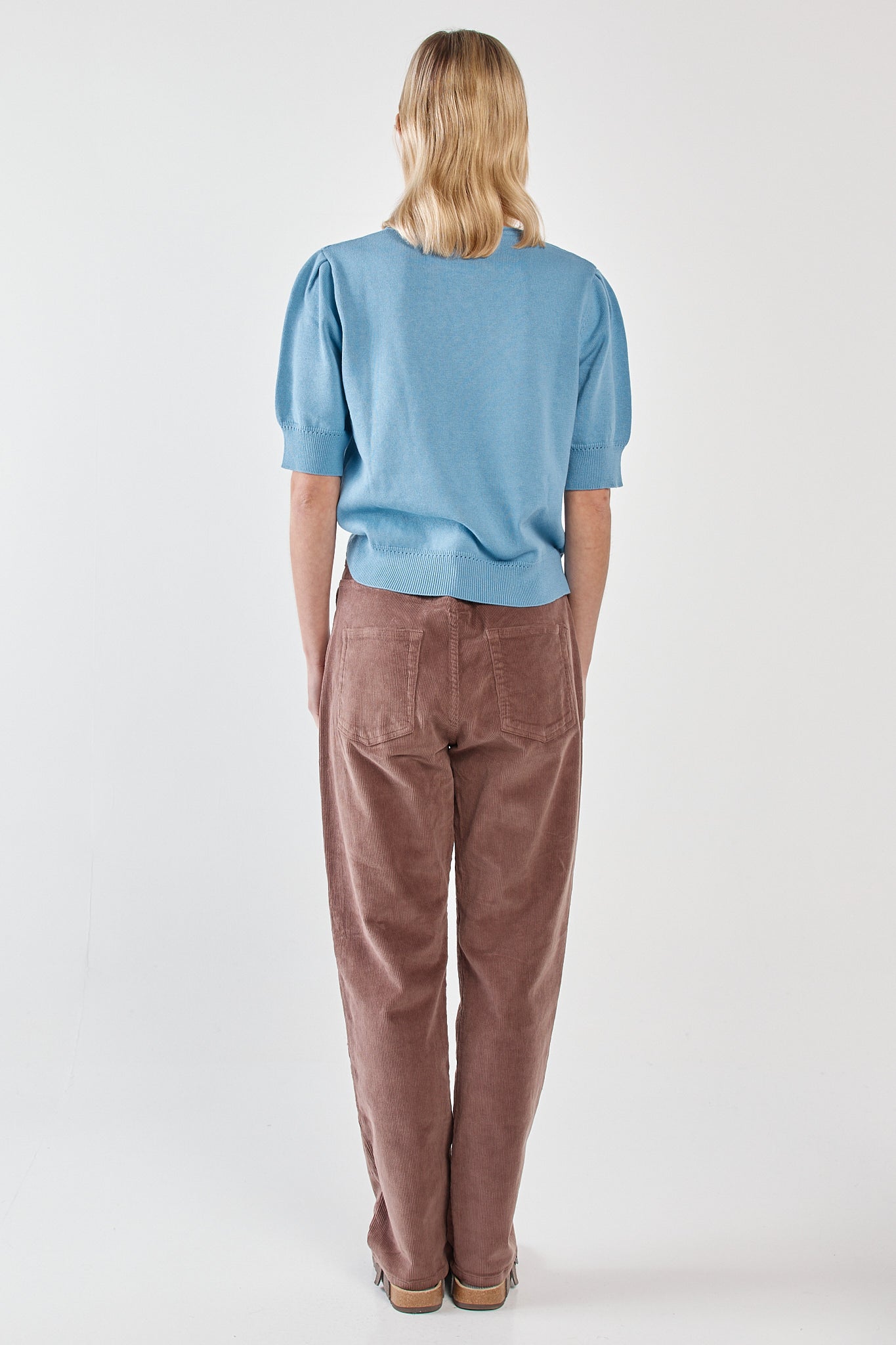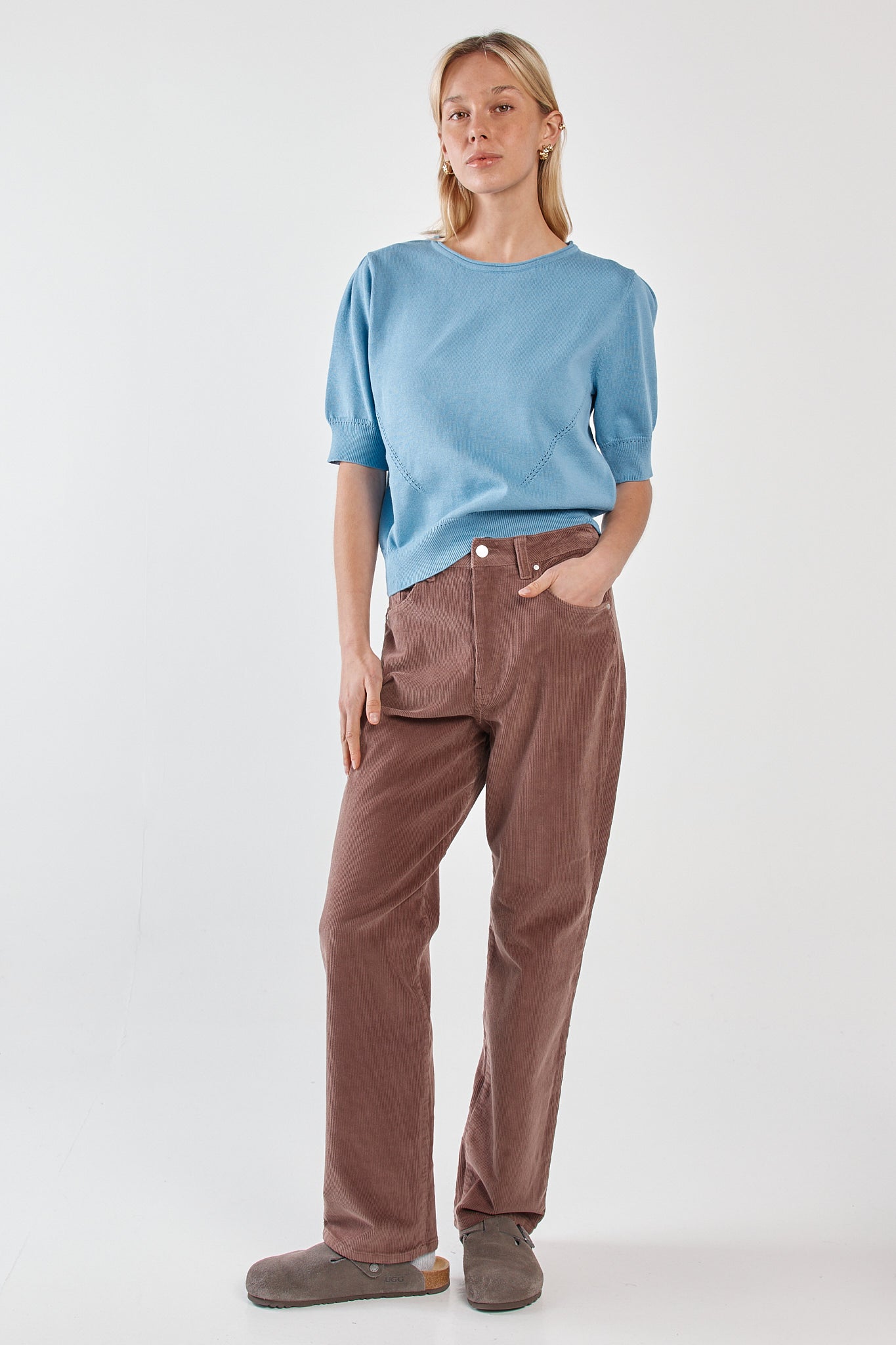 The Esti Pointelle Knit Tee is delicate knitwear with an elevated feel. Pointelle detailing and subtle rib trims add texture while keeping the silhouette polished. The rolled neckline softens the look for effortless wear. A lightweight, trans-seasonal essential with on-trend charm.