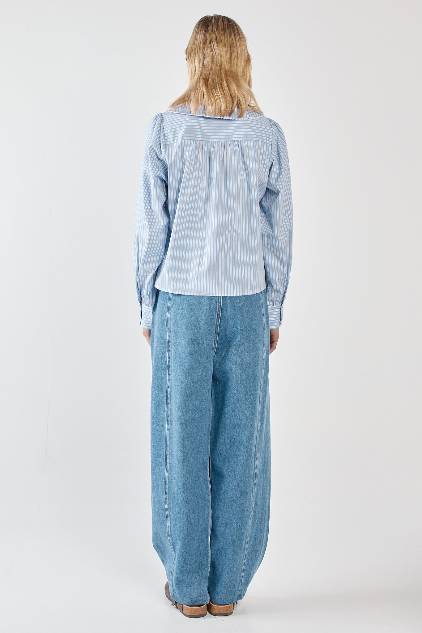 The Gypsy Large Collared Shirt makes a subtle statement. A Peter Pan collar with lace trim brings romantic detail, balanced by puff sleeves for an on-trend silhouette. Shell buttons keep the look refined and polished. An effortless, trans-seasonal piece with elevated femininity.