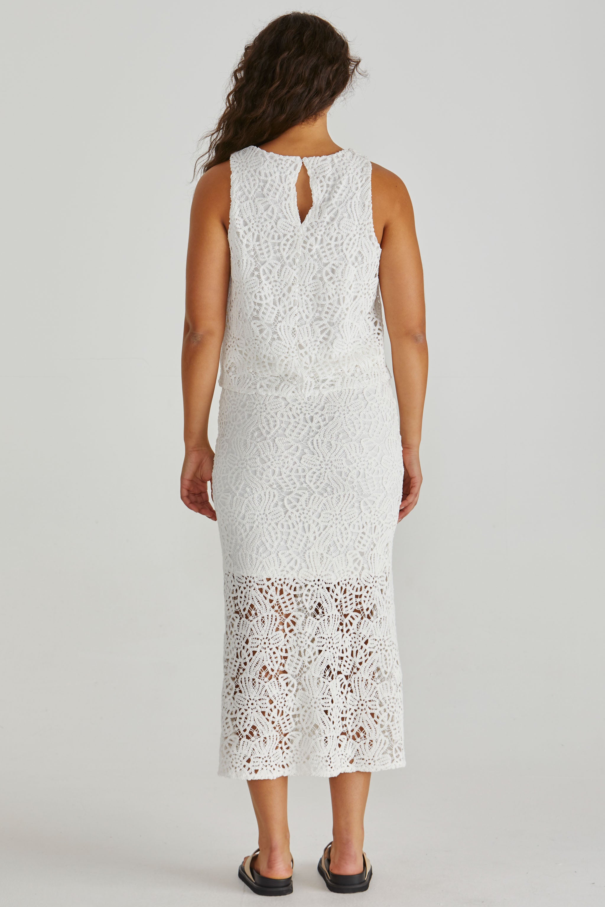 The Kai Crochet Tank is an effortless layering piece. Made in detailed lace with a soft jersey lining, it’s comfortable and stylish. The keyhole back adds a little charm. Perfect worn solo or as a set with the matching skirt.