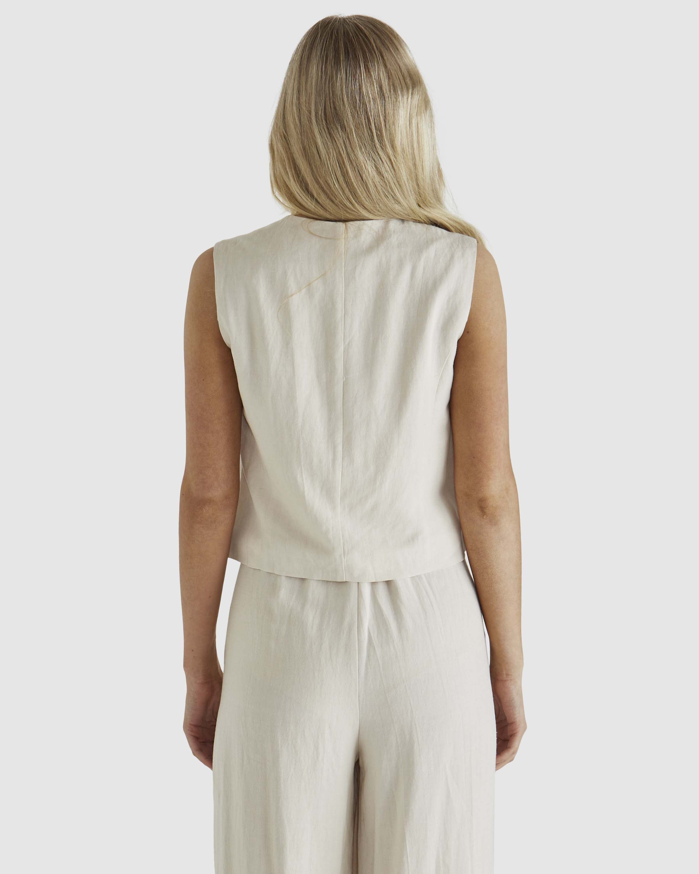 The Natalia Vest is a refined layering piece designed with soft drapey fabric and a thin tie opening for an elegant touch. Fully lined with welt pocket details, this vest is perfect for elevating both casual and formal outfits.