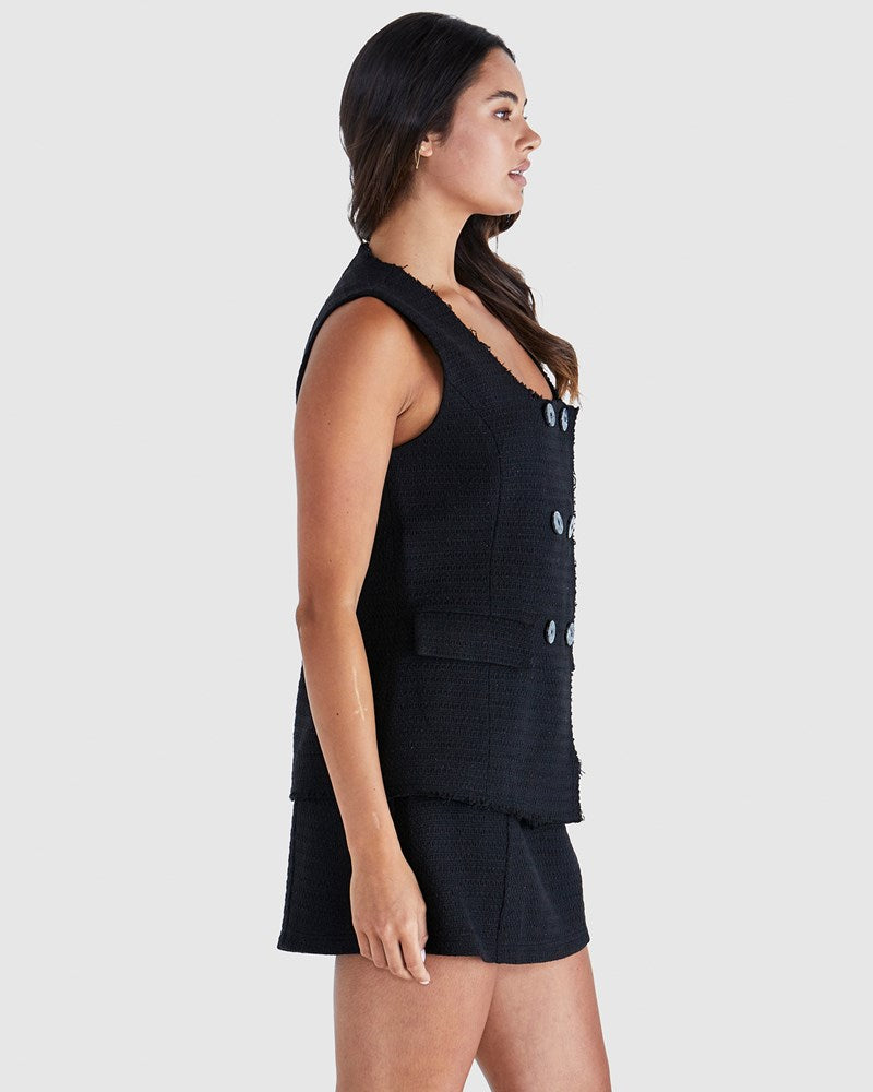 The Nico Vest is giving serious retro-cool energy. With a scoop neck, boucle texture, and cute button details, it’s a top you can dress up or down in a flash. Lined for extra comfort and style—it’s totally main-character approved.