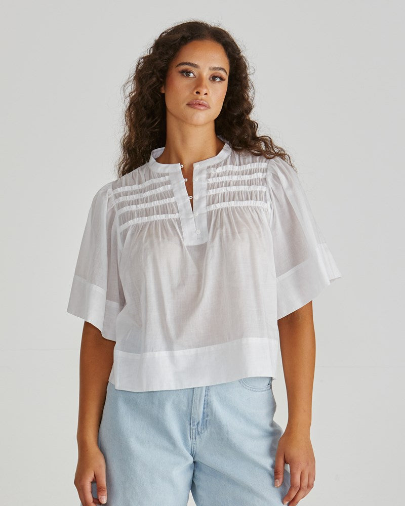 The Pammi Blouse adds a touch of vintage-inspired charm. With soft ruffle detailing, a button-up front and wide hem, it’s relaxed yet refined. The kind of top that looks good with everything.