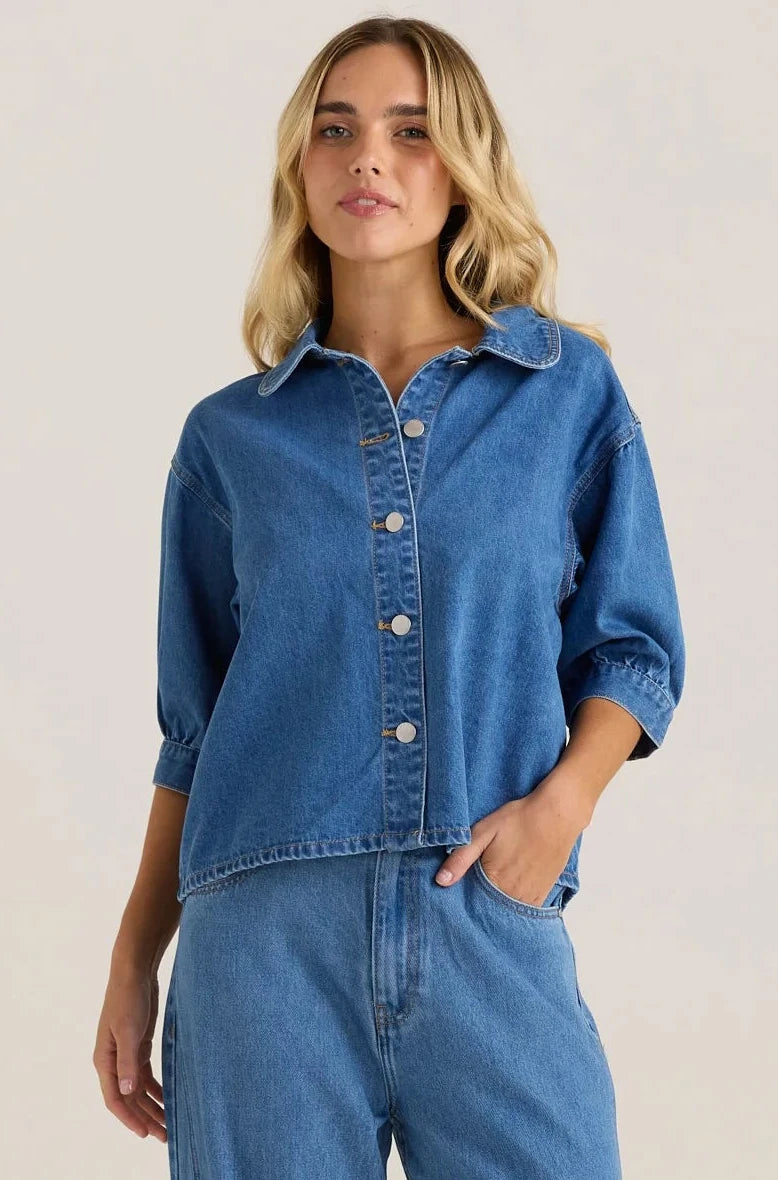 Soft denim meets playful charm in this blouse, thanks to its Peter Pan collar and thoughtful detailing throughout. It’s comfortable, easy to style, and gives your wardrobe an instant mood boost. A casual favourite with a stylish edge.
