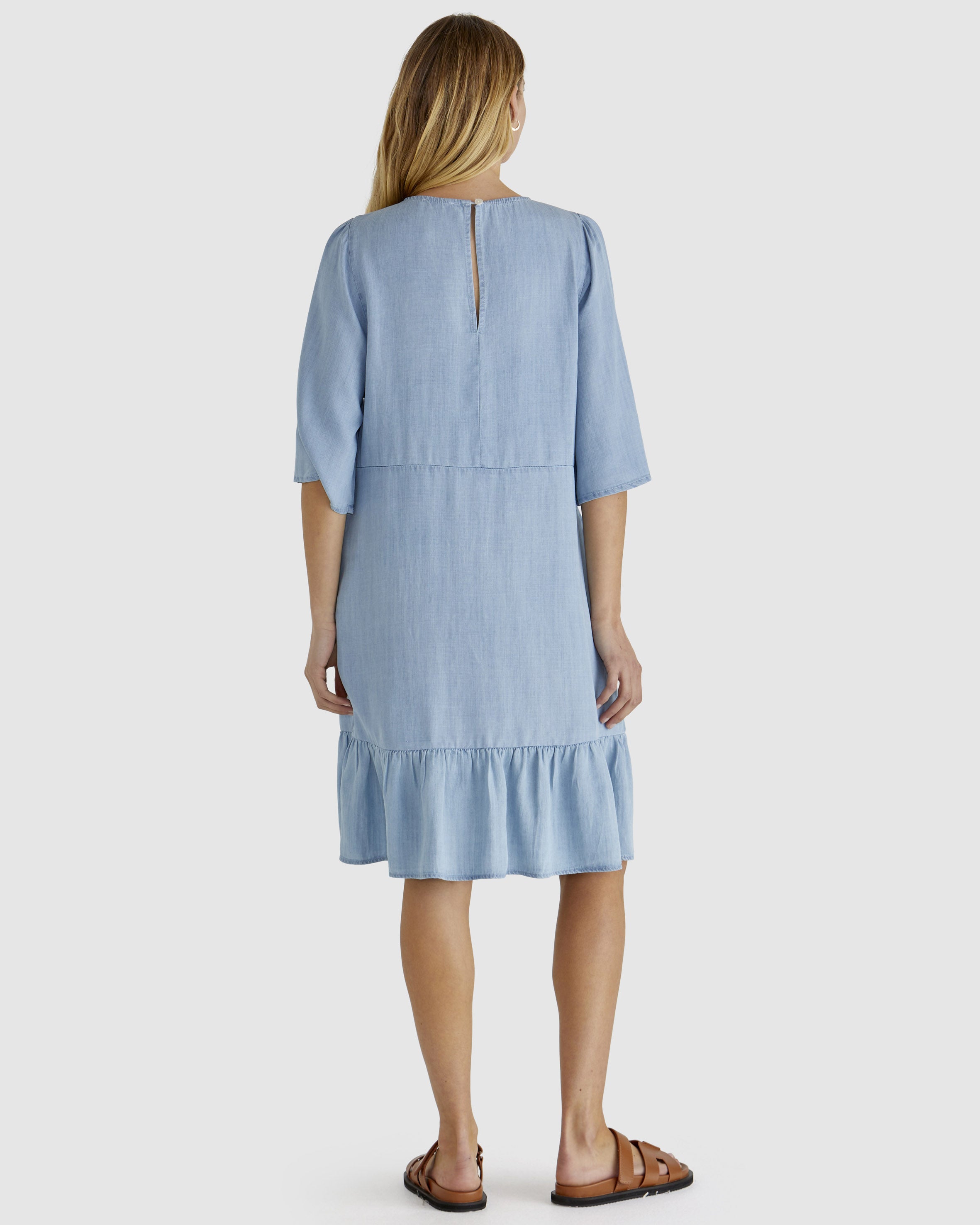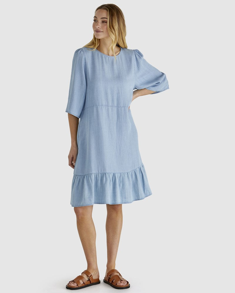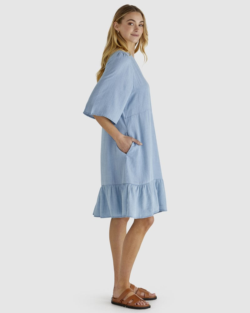 Playful yet polished, the Rye Dress features a frill hem and flute elbow-length sleeves, adding a feminine touch to its mini length. With a scoop neckline, this dress is a comfortable choice for warm-weather days, effortlessly combining style and ease.