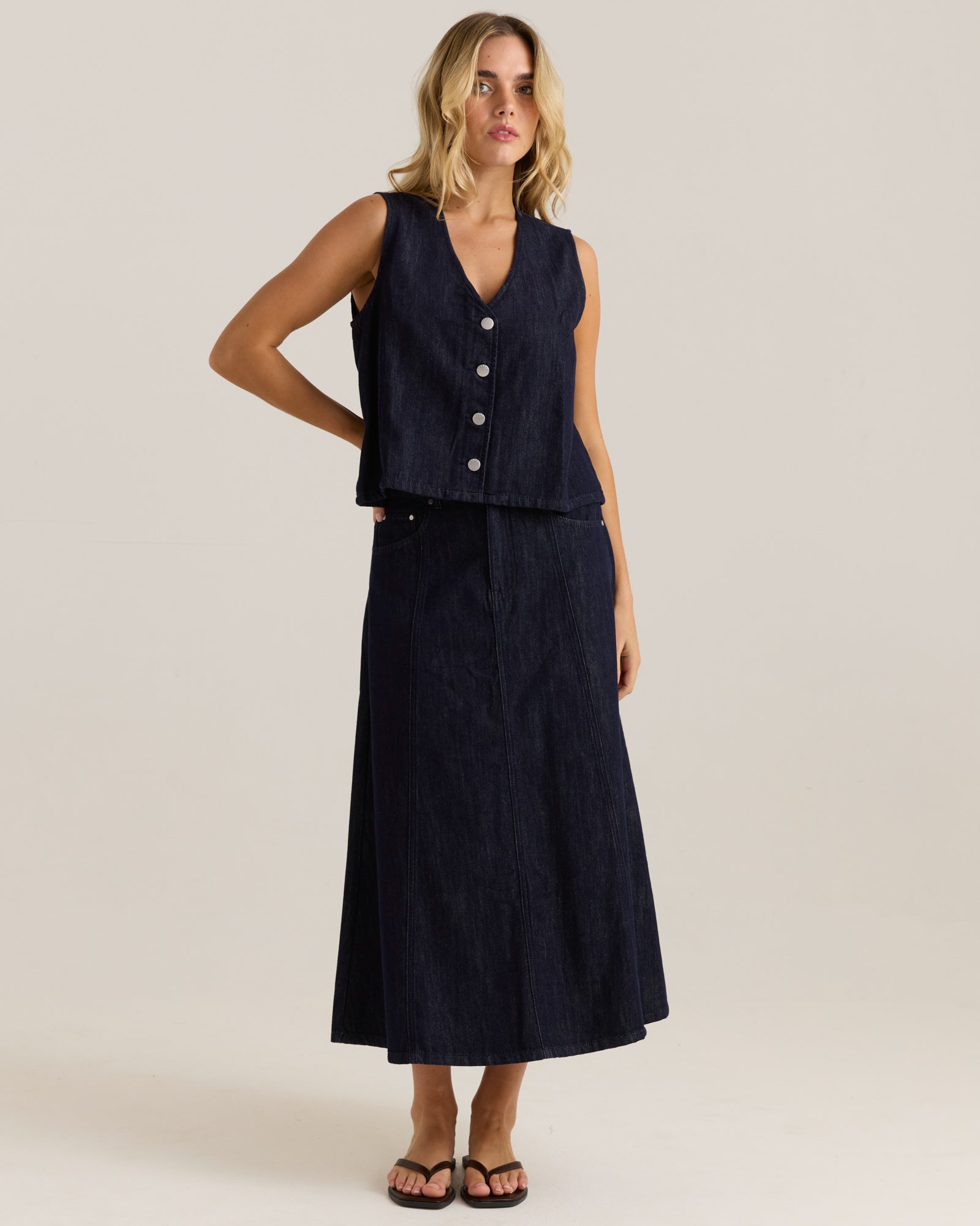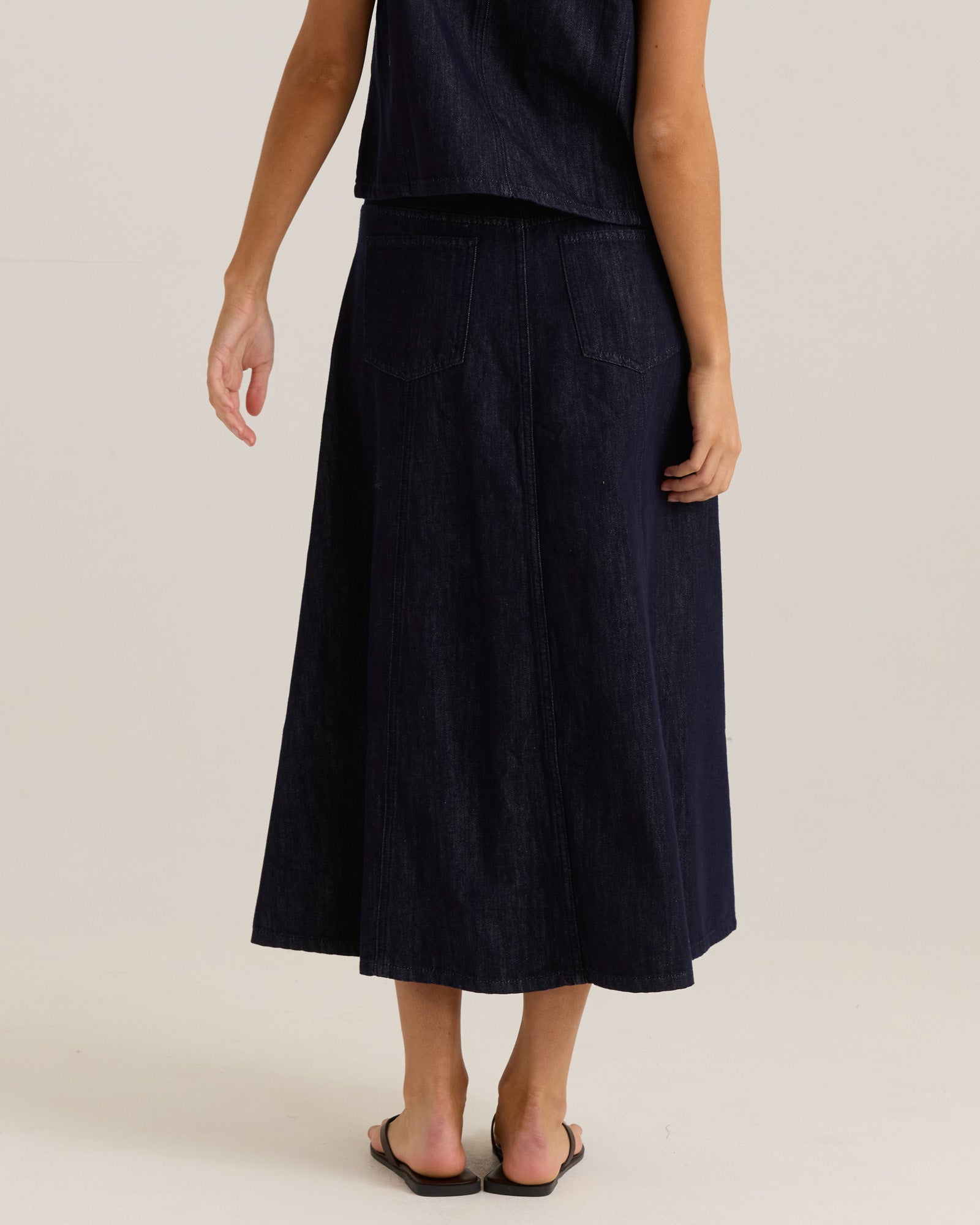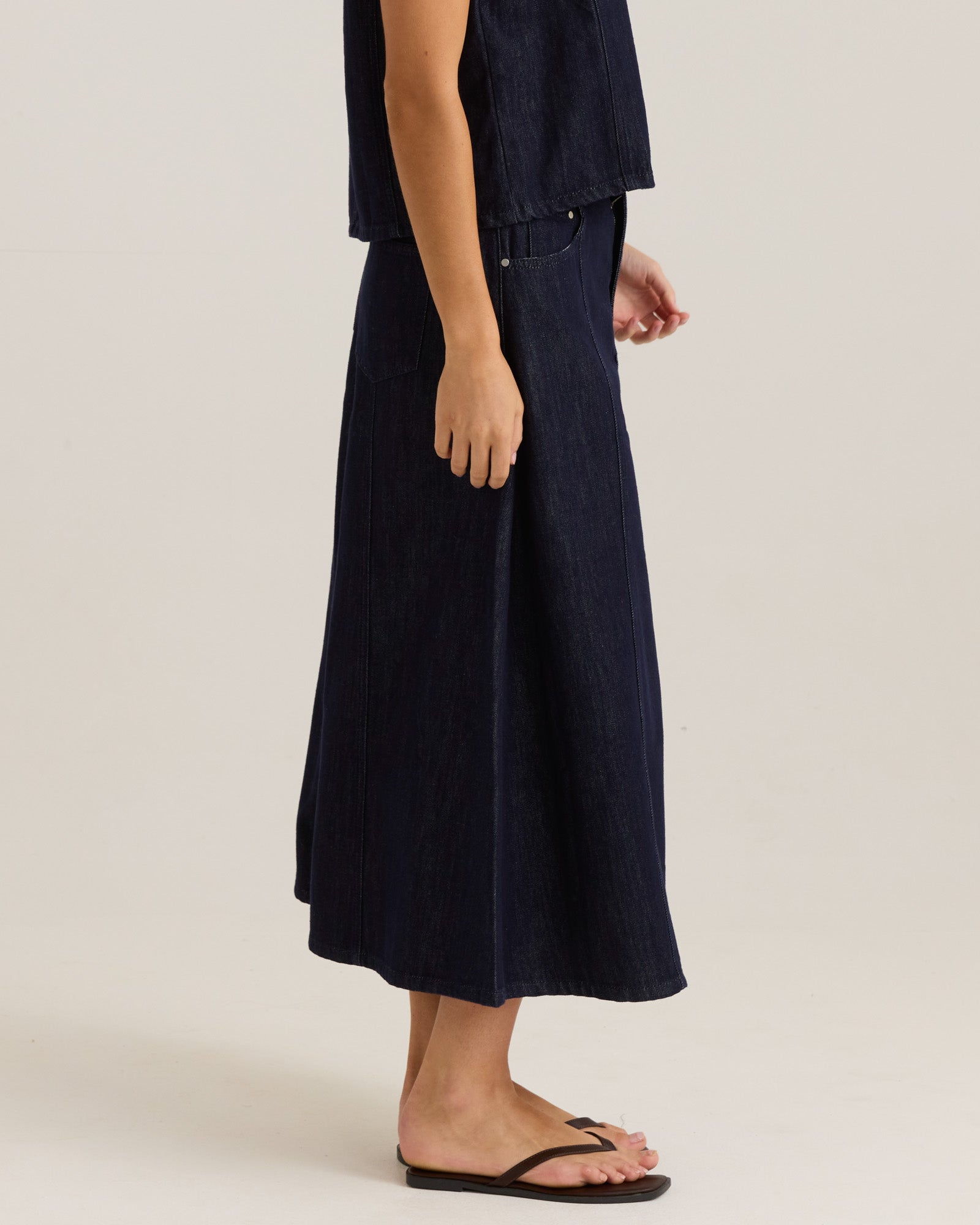 A fresh update on the classic denim skirt, the Sabine is tailored with panelled seams, branded hardware, and functional pockets. Its belt loops and regular fit offer styling versatility and everyday ease. Designed in soft denim with elevated detailing, this on-trend piece brings an effortless cool to your transeasonal wardrobe.