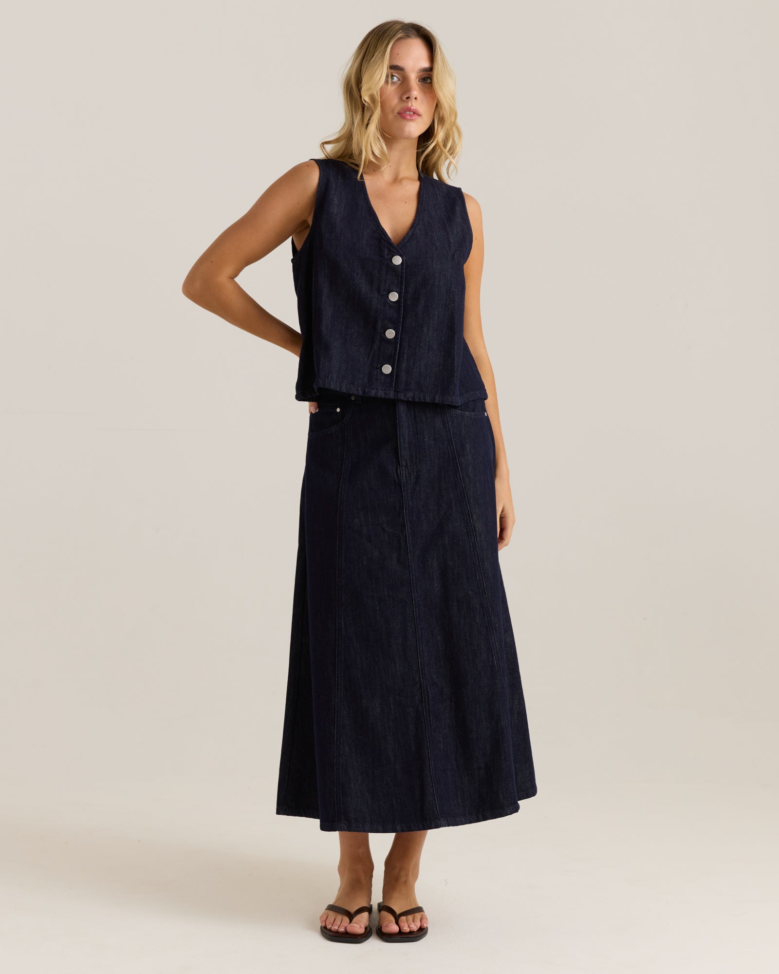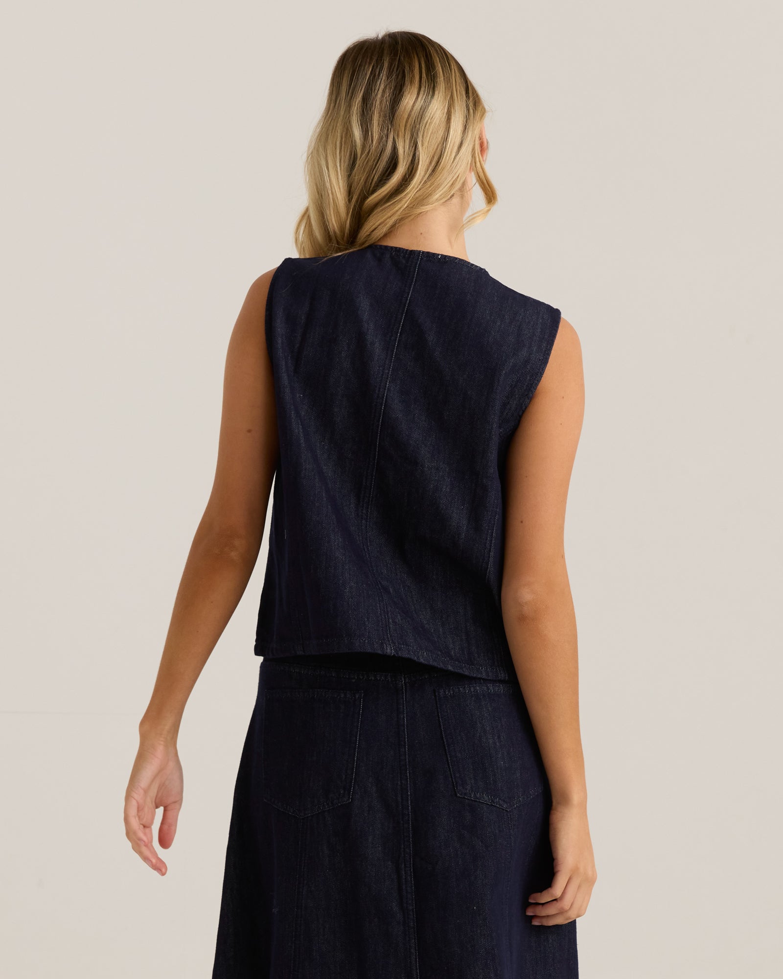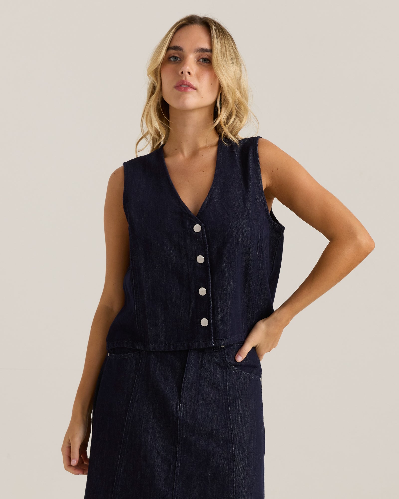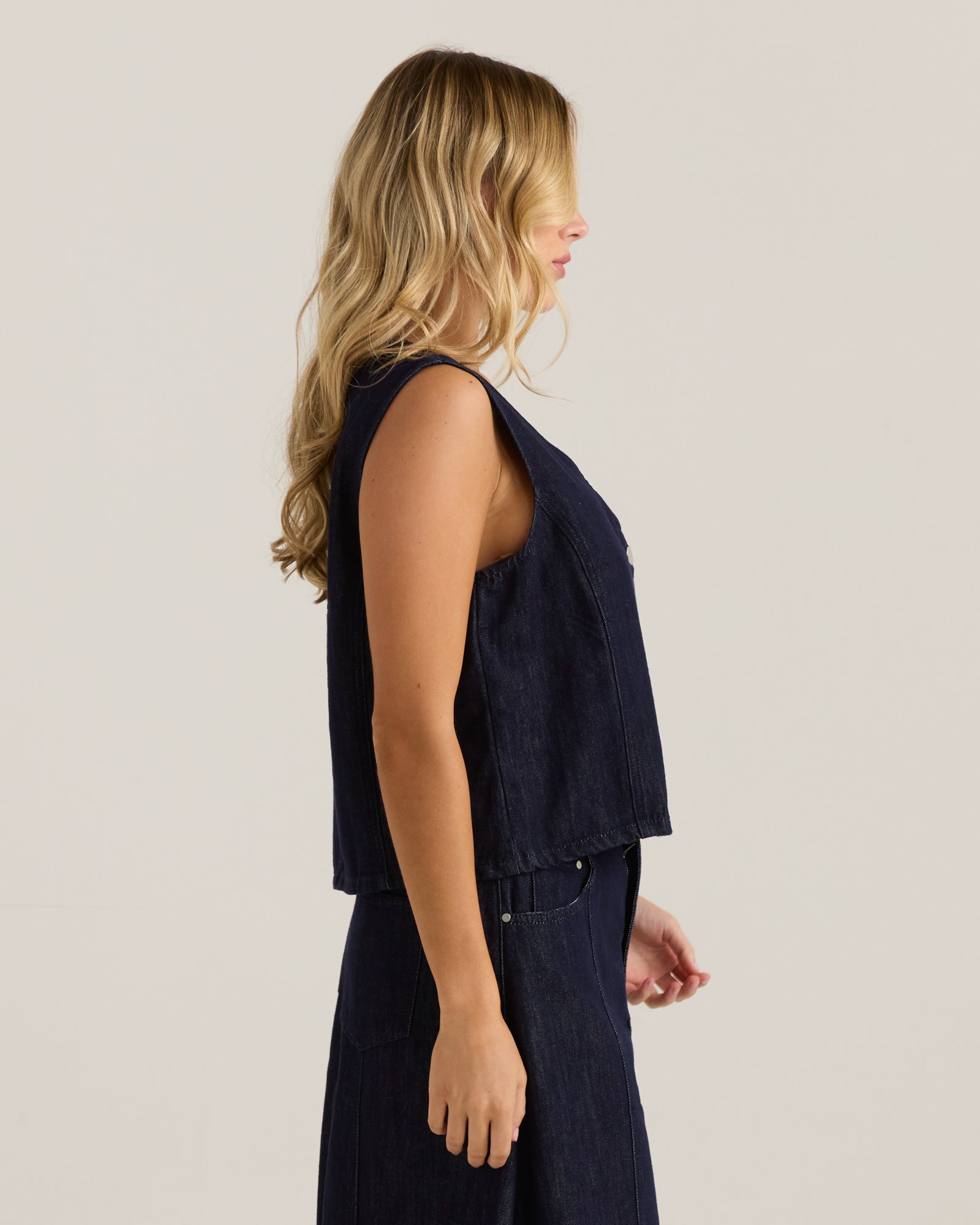 The Sabine Denim Vest is an effortlessly cool layer, designed in soft denim with contrast stitching and princess seams for a refined finish. Branded shank buttons add a touch of elevated detailing, while the relaxed fit ensures it drapes with ease. A transeasonal hero, perfect for layering over tees or pairing with matching denim for a chic statement.