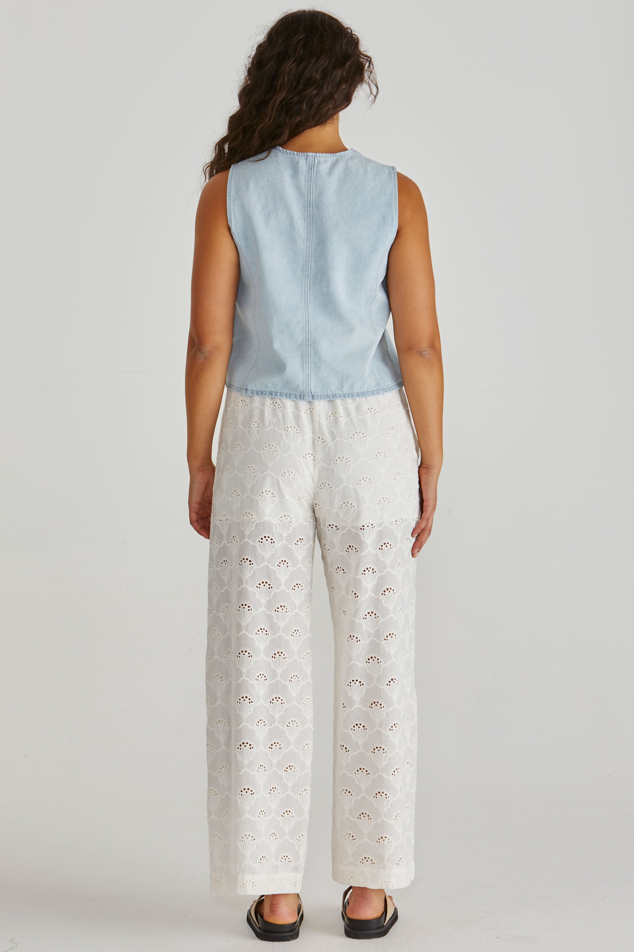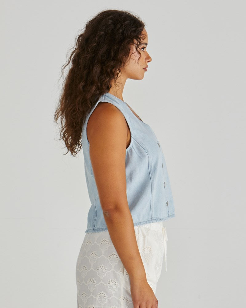 The Sabine Denim Vest brings retro energy to your look. Featuring soft denim, princess seams and branded buttons, it’s easy, cool and endlessly wearable. Style it solo or layered for an on-trend set vibe.