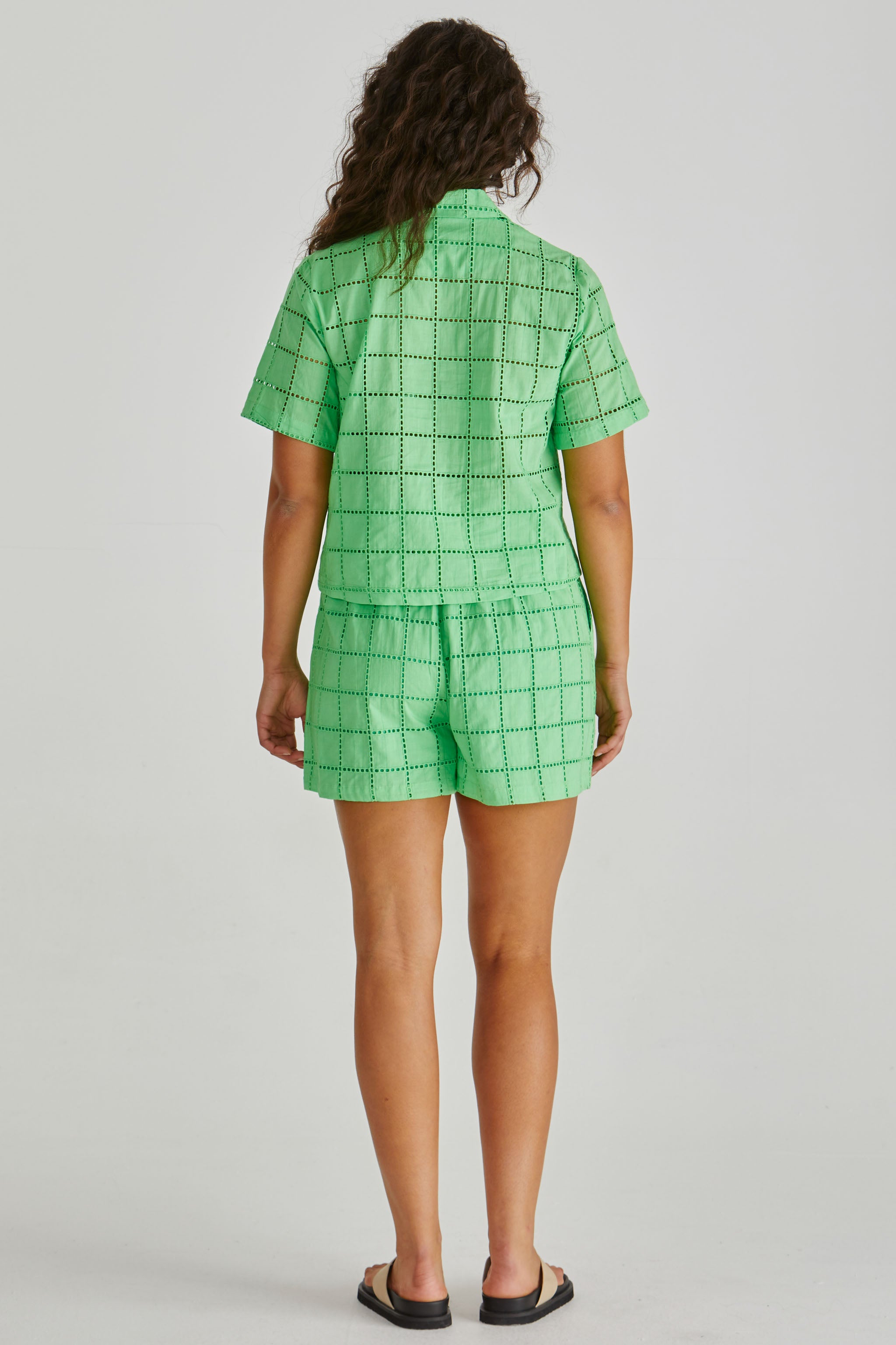 The Spencer Shirt blends laid-back styling with a touch of texture. Crafted from grid-style broderie, it’s light, airy and perfect for layering. The camp-style collar keeps it cool and effortless.
