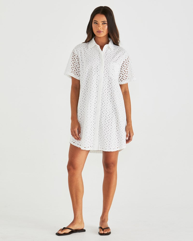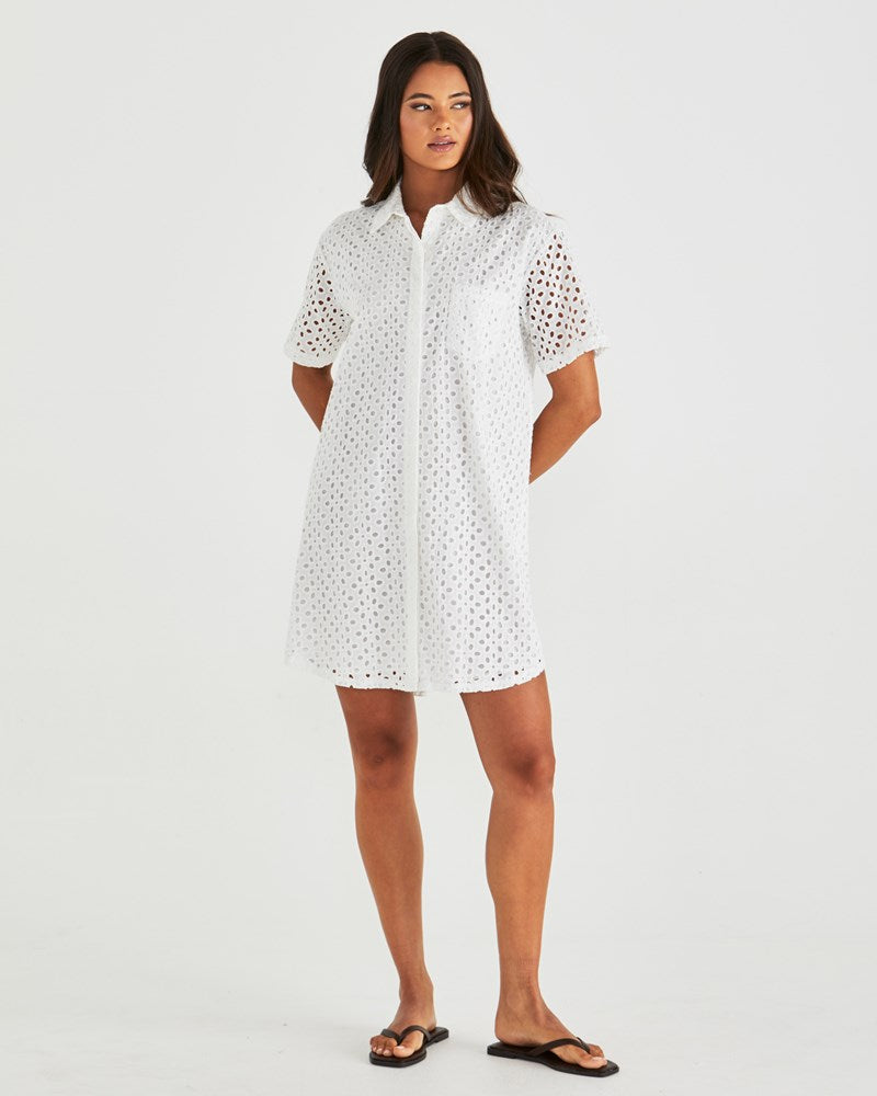 This one does it all. The Steva Shirt Dress has soft broderie, a curved hem, and concealed buttons for a polished finish. Lined where it counts and ready for summer.
