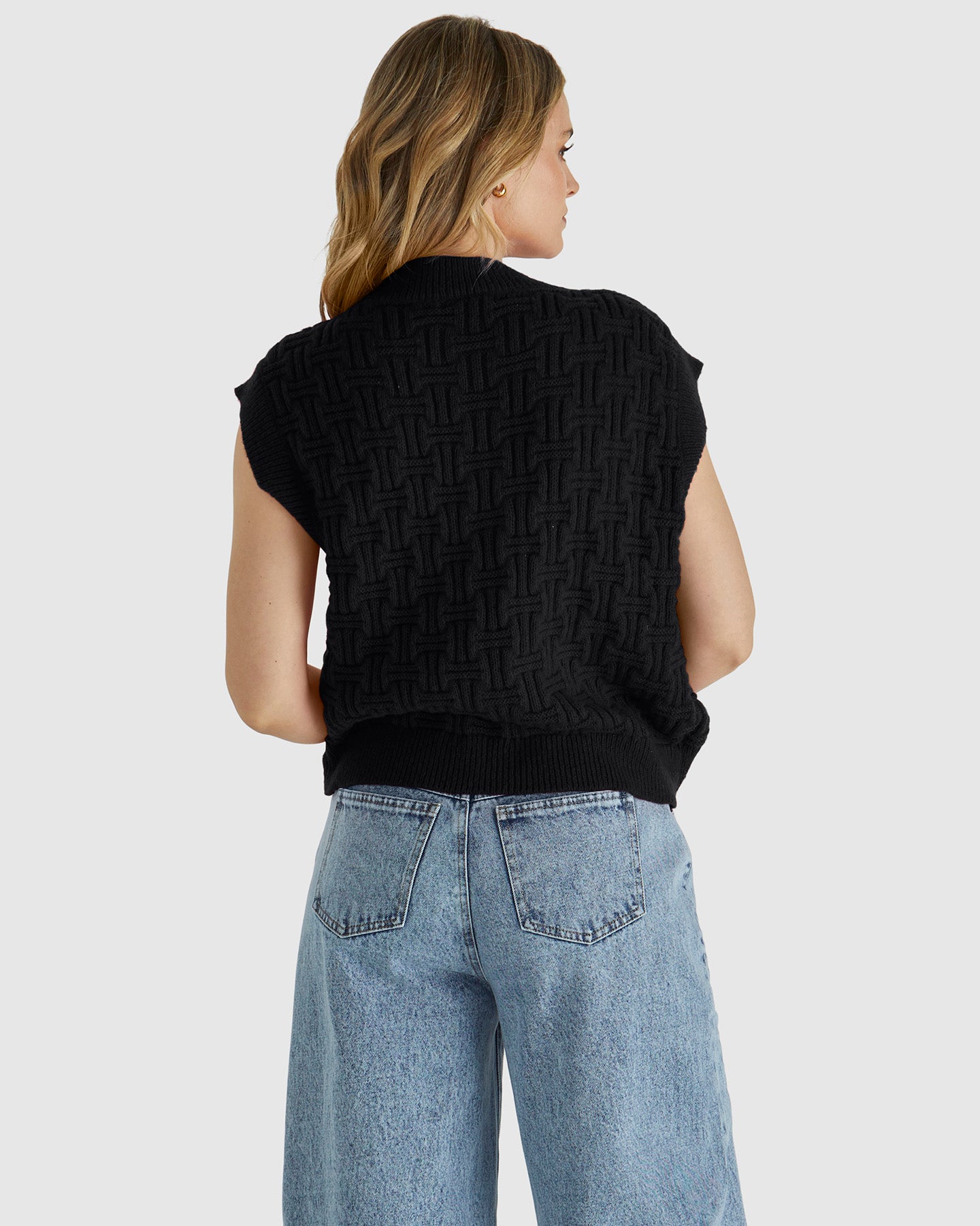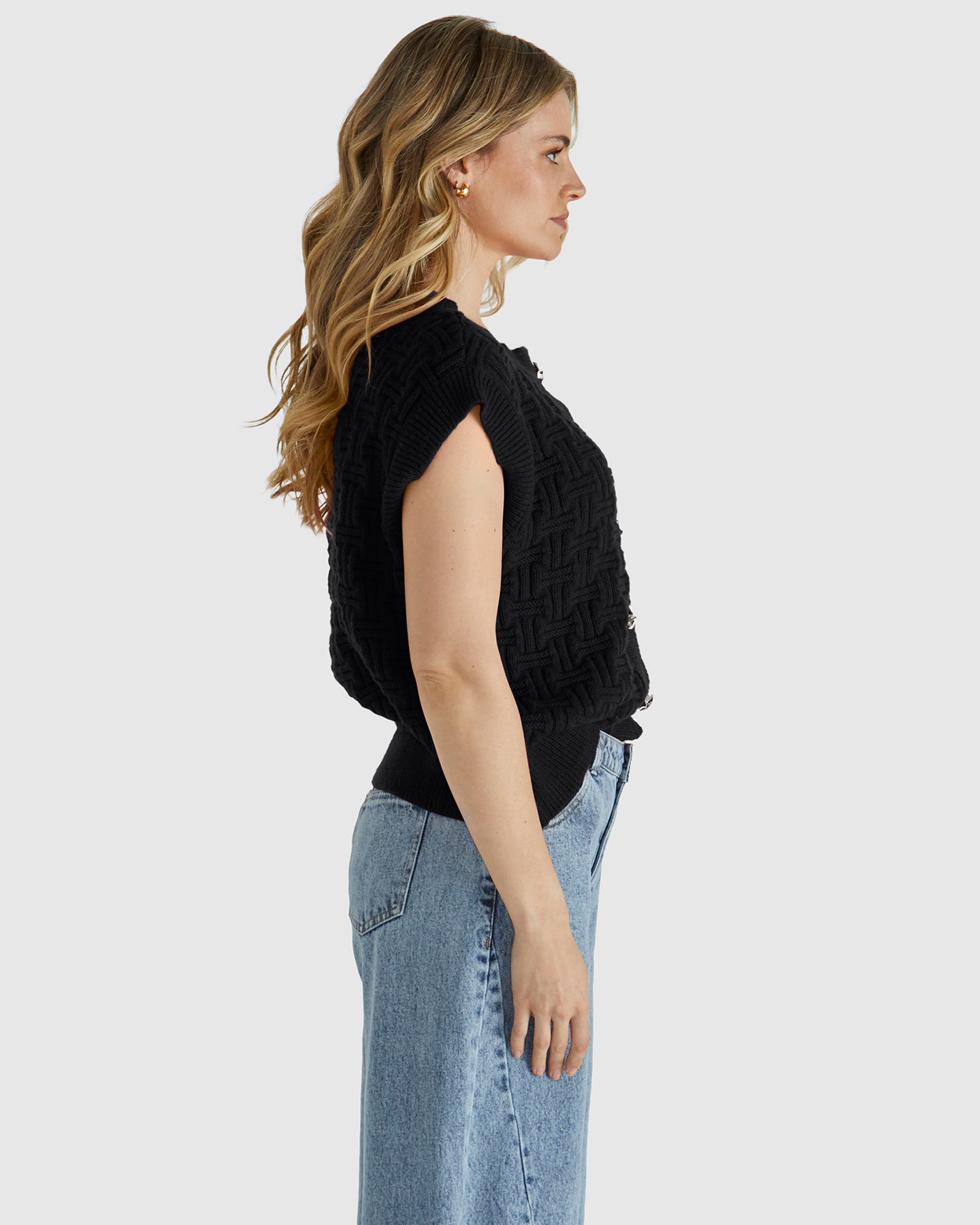 This oversized knit vest is your layering essential with a cool basket weave design. Silver button closures add an elevated edge, while wide ribbing details bring texture. The comfortable fit makes it easy to throw over a tee or style solo. Effortlessly chic and endlessly versatile!