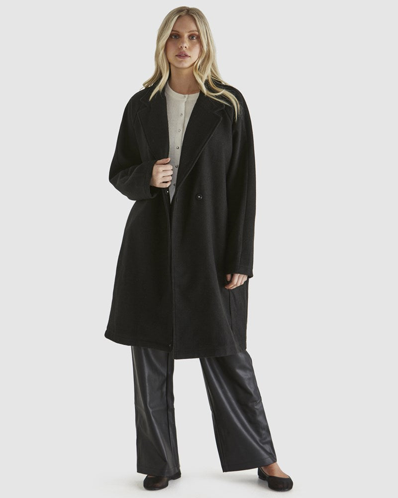 The Zaria Coat is an elegant outerwear choice for colder days. With a boucle texture, self-covered snap closures, and side pockets, this oversized coat offers both warmth and sophistication. Fully lined, it’s perfect for layering over any outfit.
