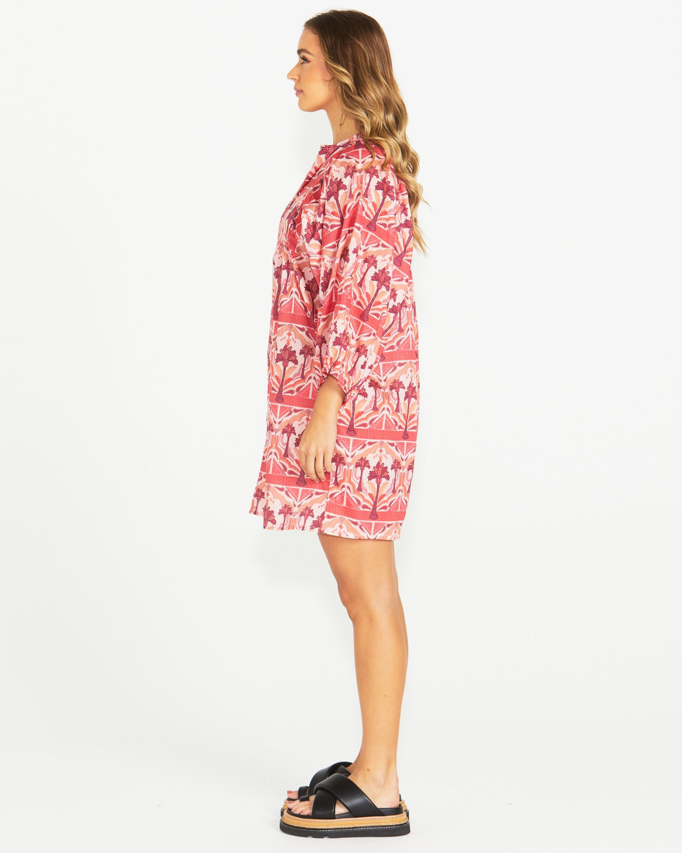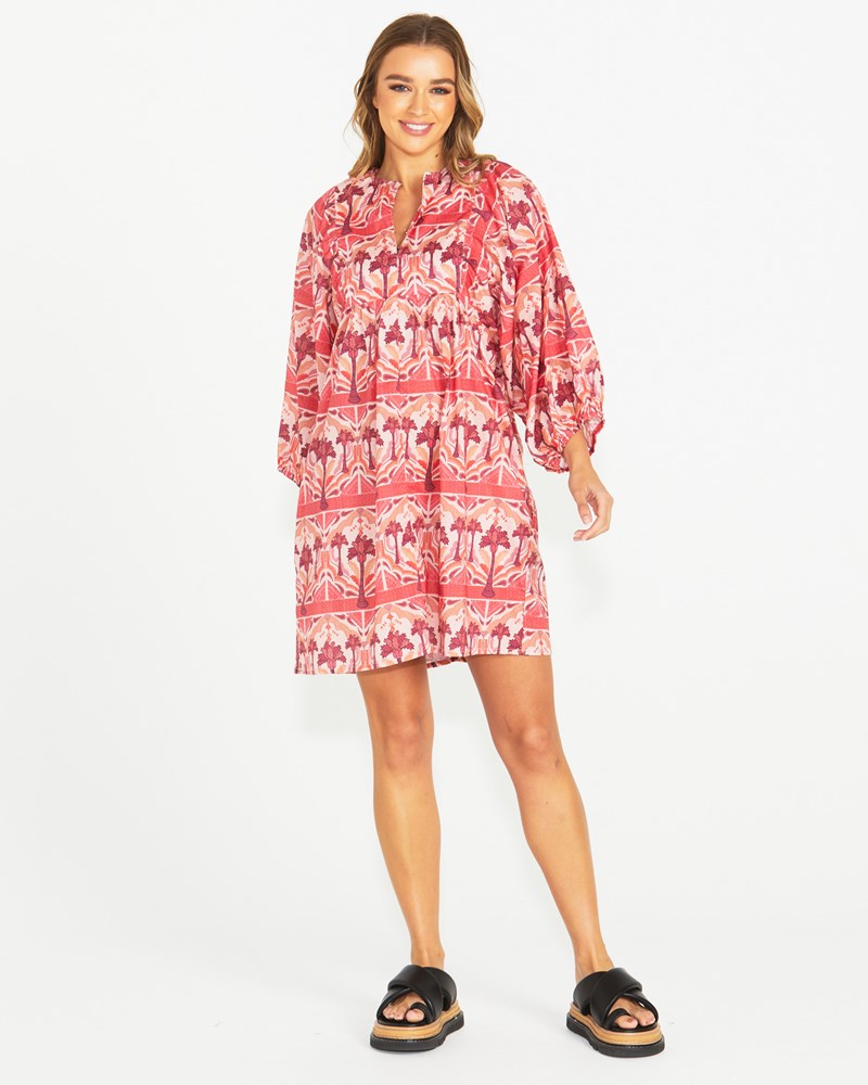 The Zayda Dress combines style and comfort with its thigh-length cut and oversized gathered sleeves. Front yoke detailing adds a chic touch. A great option for both casual and dressy occasions.